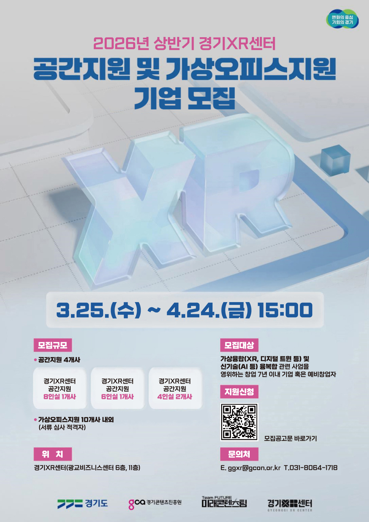경콘진은 '2026년 상반기 경기XR센터 공간지원 및 가상오피스지원 기업 모집'을 공고하고, 차세대 융복합 콘텐츠 기업 선발한다.