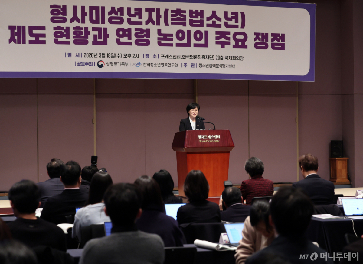 ![[서울=뉴시스] 배훈식 기자 = 원민경 성평등가족부 장관이 18일 오후 서울 중구 한국프레스센터에서 열린 제2차 청소년정책 포럼 '촉법소년 제도 현황과 연령 논의의 주요 쟁점'에서 인사말을 하고 있다. 2026.03.18. /사진=배훈식](https://thumb.mt.co.kr/cdn-cgi/image/f=avif/21/2026/04/2026040116220792216_1.jpg)