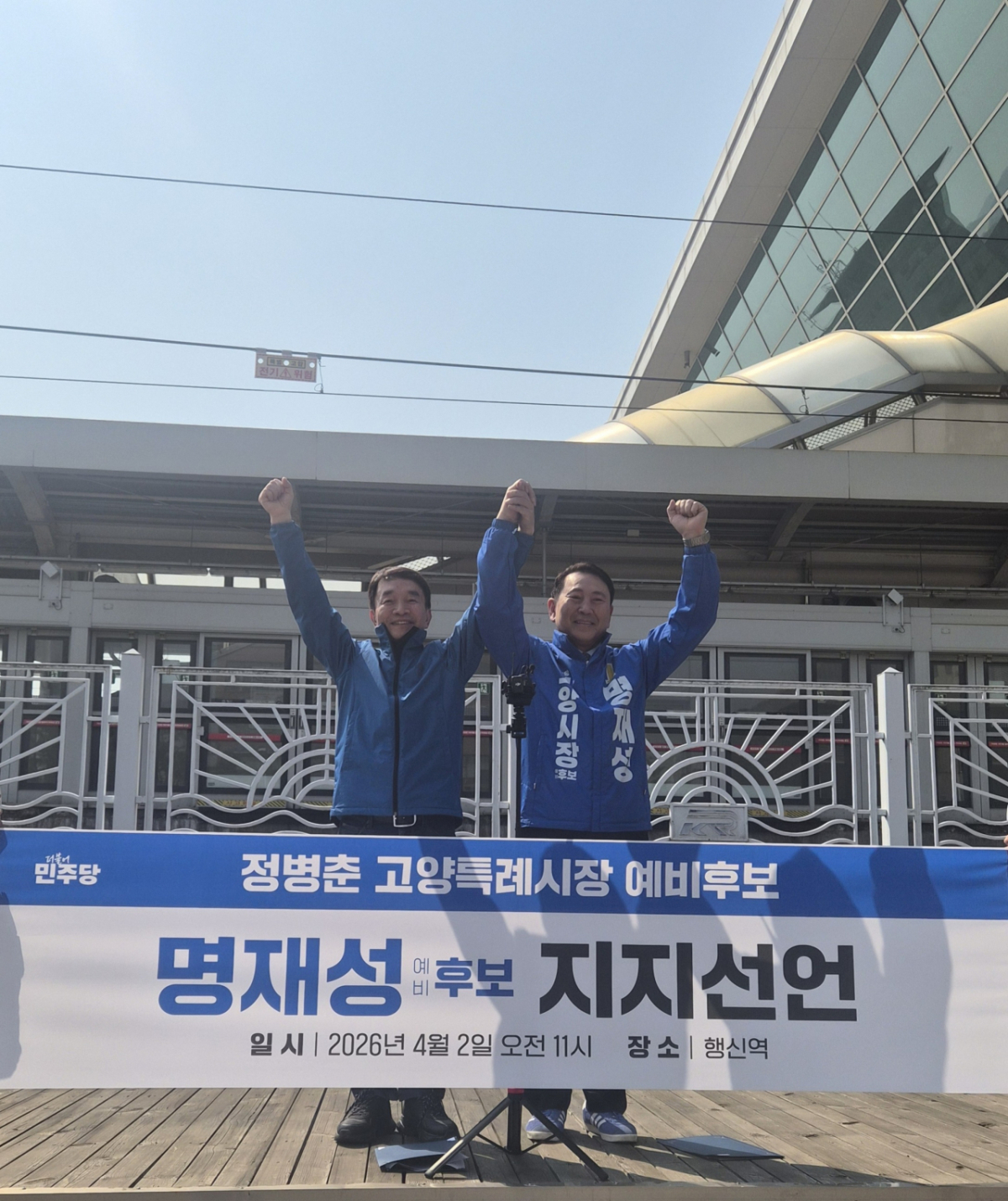 정 전 예비후보는 지난달 30일 사퇴한 뒤 2일 행신역에서 명 예비후보 지지를 공식 선언했다. 그는 입장문을 통해 "명 후보가 걸어온 39년의 공직을 곁에서 지켜봤다"며 "탁상 공론에 머무르는 정치인이 아니며 현장에서 목소리를 행정의 언어로 바꾸고 복잡한 갈등을 해결의 실마리로 풀어내는 준비된 행정가로 고양시의 위기를 잘 극복하고 새로운 도약을 이끌 적임자라고 확신한다"고 말했다.