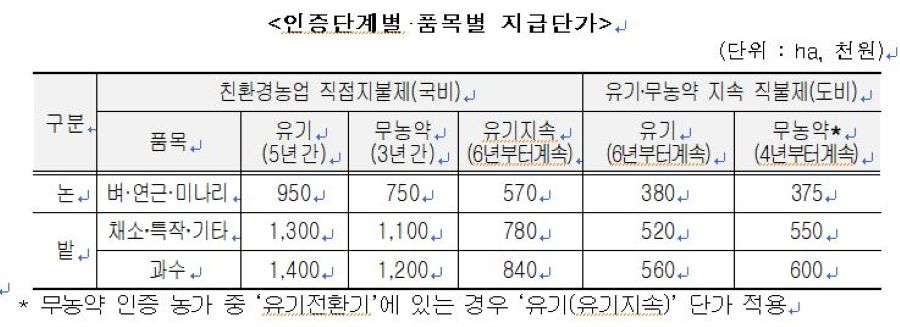 친환경직불제 5년(5회)을 받은 농가는 도비 사업인 유기·무농약지속직불제로 친환경농업직불제 단가의 40~50%가 지원된다.