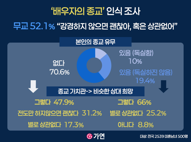 가연결혼정보㈜(이하 가연)가 3일 '배우자의 종교'를 주제로 25~39세 미혼남녀 500명의 인식을 조사한 결과를 발표했다. 조사는 지난해 오픈서베이를 통해 진행됐으며 신뢰수준 95%에 표본오차는 ±4.38%P다.