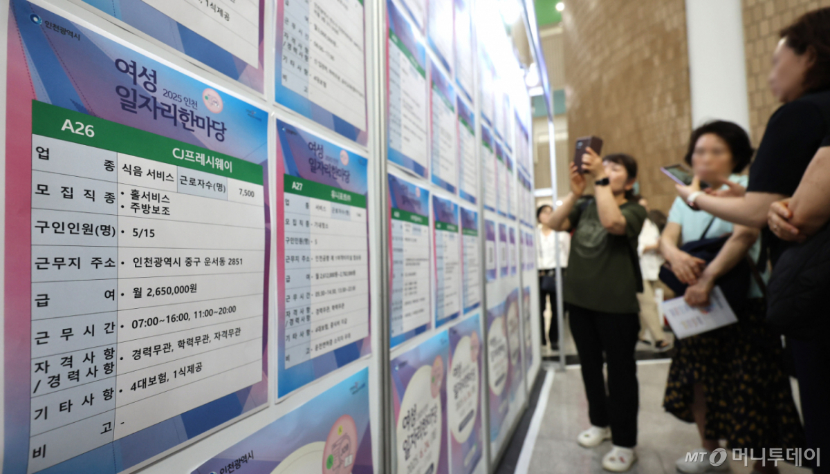 ![[인천=뉴시스] 전진환 기자 = 24일 오후 인천 남동구 인천시청에서 열린 2025 인천여성 일자리 한마당에서 구직자들이 채용게시판을 살피고 있다. 2025.06.24. /사진=전진환](https://thumb.mt.co.kr/cdn-cgi/image/f=avif/21/2026/04/2026040313384886282_1.jpg)