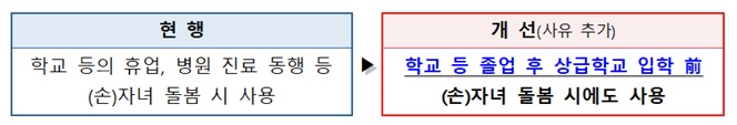 먼저 가족돌봄휴가 사용 사유가 확대된다. 기존에는 학교 휴업이나 병원 진료 동행 등 제한적인 경우에만 사용할 수 있었지만, 앞으로는 자녀나 손자녀가 어린이집·유치원·학교 등을 졸업한 뒤 상급학교에 입학하기 전까지 발생하는 '학적 공백기'에도 휴가 사용이 가능해진다. 이에 따라 돌봄 공백으로 인한 부담이 줄어들 것으로 기대된다.