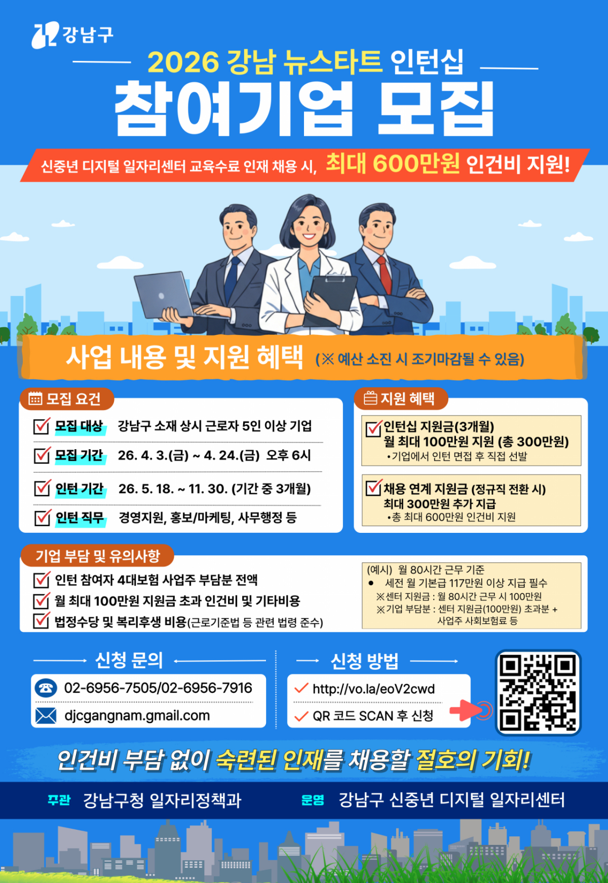 서울 강남구는 40~60세 중년 구직자와 관내 기업 일자리를 연계하는 '2026년 강남 뉴스타트 인턴십' 참여기업을 모집한다고 7일 밝혔다.