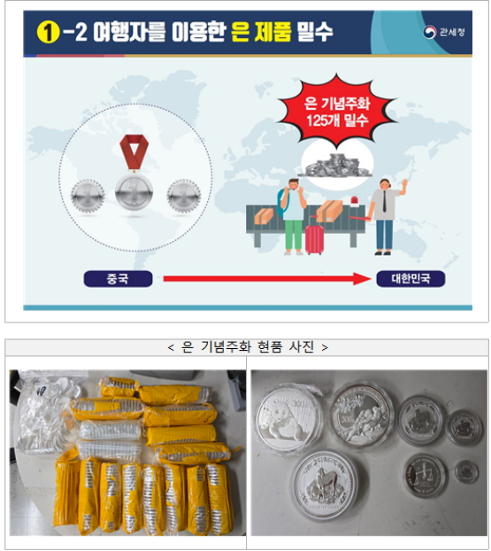 △여행자가 해외에서 구입한 은을 인천공항 등을 통해 입국하면서 휴대 밀반입하거나 △특송화물을 이용해 목걸이, 반지 등 개인용품으로 위장, 밀수하는 수법이 주로 적발되고 있다.