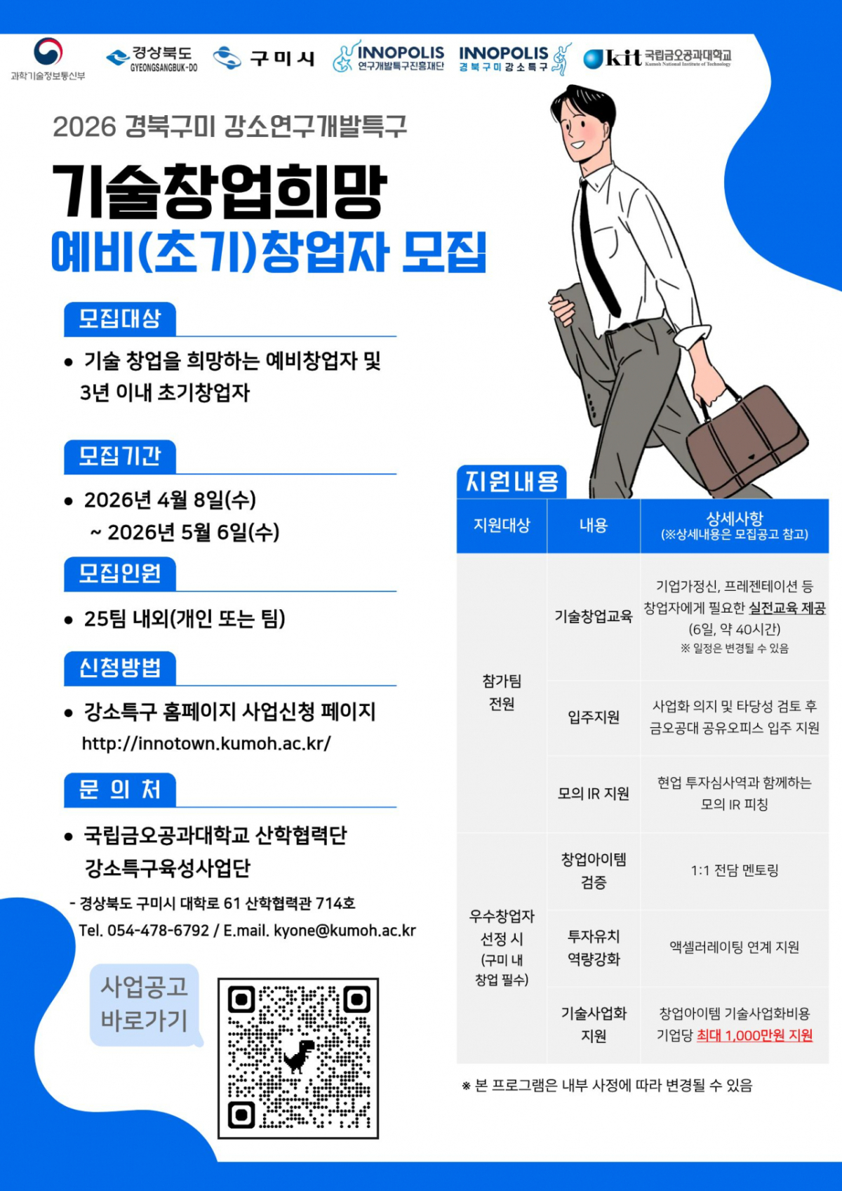 모집 규모는 25개 팀 내외며, 신청은 경북구미강소특구 홈페이지를 통해 가능하다. 선정된 교육생에게는 금오공대 공유오피스(INNOTOWN24) 입주 기회와 모의 투자 유치 등 후속 지원을 제공한다. 교육 후 '우수창업자 경진대회'에서 우수창업자로 선정될 경우 최대 1000만원의 시제품 제작비도 지급한다.