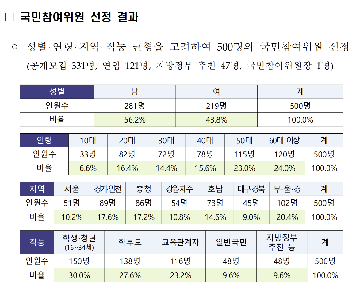 국교위 관계자는 "10대 지원자가 가장 적었지만 다른 연령대보다 확대 선발했다"며 "1기에서 10대 비중이 2.4%였던 점을 감안하면 2기에서는 참여 폭이 넓어진 측면이 있다"고 설명했다. 이어 "지역 편차의 경우에도 참여 의지와 관심도를 종합적으로 평가한 결과"라며 "위원에 대한 심사는 지역이 아닌 직능으로 구분해 진행됐다"고 했다.