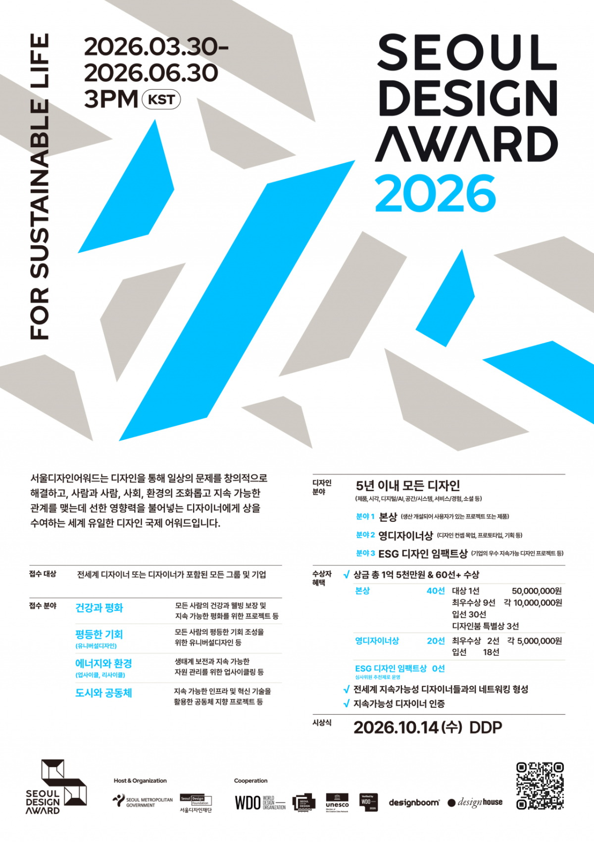 올해도 서울디자인어워드는 전쟁과 재난, 물과 에너지, 공동체와 환경 문제를 바꾸는 해법을 찾는 무대로 꾸려진다. 총상금은 1억5000만원 규모이며 60선 이상을 선정한다. 시상식과 국제 콘퍼런스는 오는 10월 동대문디자인플라자(DDP)에서 열린다. 차강희 서울디자인재단 대표이사는 "서울디자인어워드는 더 나은 일상을 만들고 세상을 지속가능하게 변화시키는 디자인의 가치를 조명하는 담론의 장"이라며 "선한 영향력으로 변화를 이끄는 디자이너들의 적극적인 참여를 기대한다"고 말했다.