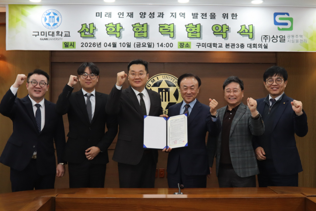 구미대학교 반도체전자통신공학부가 지난 10일 본관 대회의실에서 공동주택 위탁관리 전문기업 ㈜상일종합관리와 재직자 평생학습과정 운영 및 직무능력 향상을 위한 업무협약을 체결했다고 13일 밝혔다.