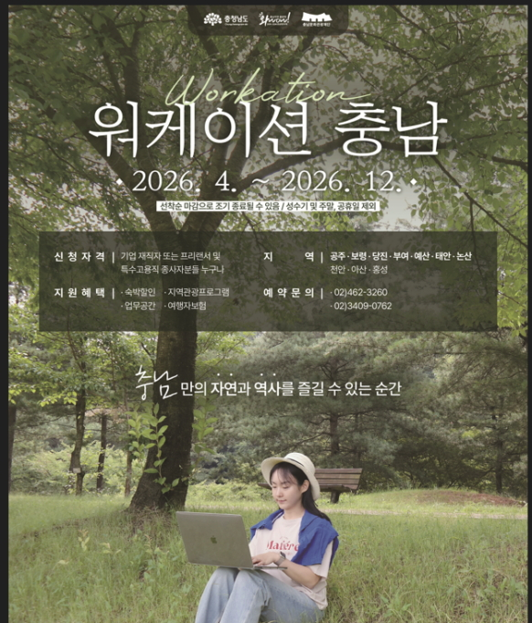 도 관계자는 "워케이션을 주중 체류형 관광의 핵심 수단으로 활용해 연중 관광수요를 균형 있게 확보할 것"이라며 "앞으로도 마케팅 창구를 확대하고 도내 자연·문화자원과 결합한 상품 개발에 힘써 충남을 머무르고 싶은 관광지로 만들어 갈 것"이라고 말했다.