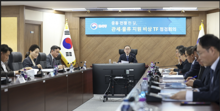 관세청은 13일 정부대전청사에서 이명구 청장 주재로 중동 상황 장기화에 따른 수출입기업 피해를 최소화하기 위한 '관세·물류 비상 대응 TF 점검회의'를 개최하고 앞으로의 지원 방향 등을 논의했다.