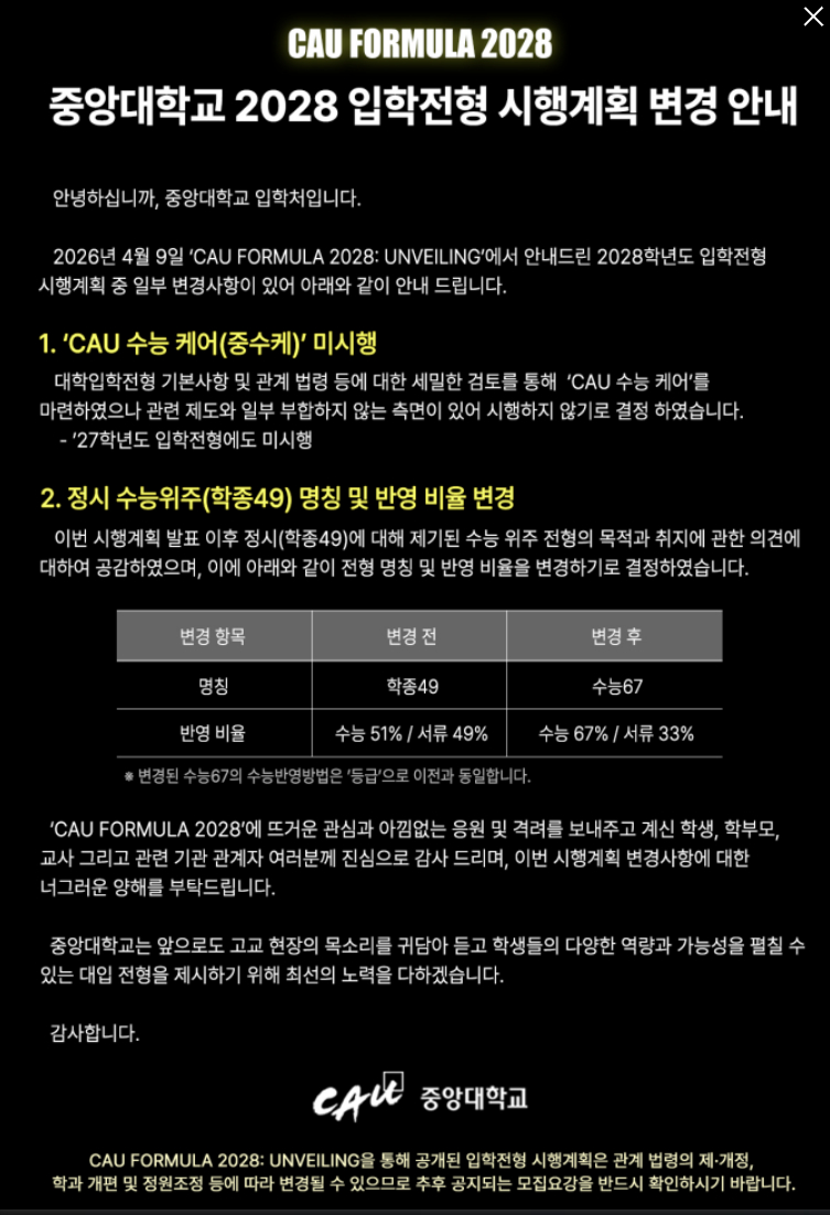중앙대는 13일 입학처 홈페이지에 '2028 입학 전형 시행 계획 변경 안내문'을 공지했다. 해당 공지에서 중앙대는 논란이 됐던 'CAU(중앙대) 수능 케어'를 미시행한다고 알렸다.