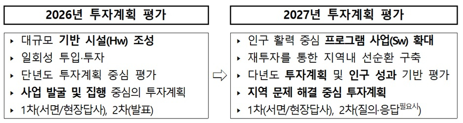 이번 개편의 핵심은 '살기 좋은 동네 만들기'에 초점을 맞춘 투자 구조 전환이다. 일자리, 주거, 돌봄 등 주민 생활과 직결된 사회서비스 확대와 정주 여건 개선 사업이 평가의 중심이 된다.