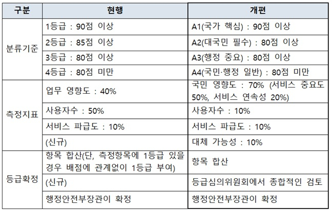 개편안에 따르면 정보시스템은 △국민 영향도(70%) △서비스 파급도(10%) △대체 가능성(10%) △사용자 수(10%) 등을 종합 평가해 A1(국가 핵심)부터 A4(일반 행정)까지 4단계로 분류된다.