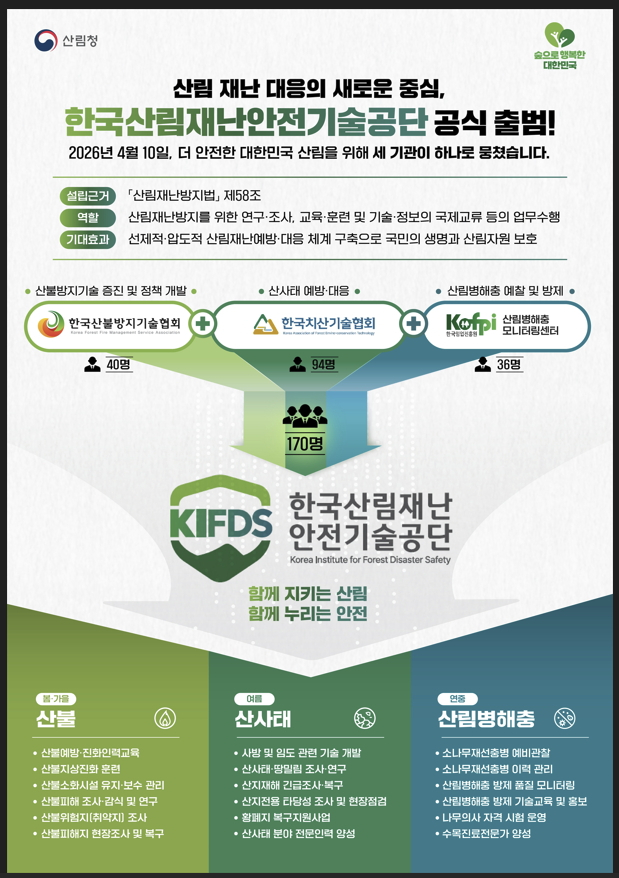 산림재난 대응 효율성을 높이기 위해 산림청 산하 공공기관을 통·폐합한 '한국산림재난안전기술공단'이 공식 출범했다.