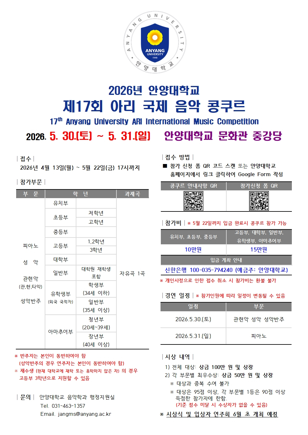 안양대학교 음악학부가 다음달 30~31일 교내 문화관 중강당에서 '2026년 제17회 아리 국제 음악 콩쿠르'를 개최한다고 15일 밝혔다.