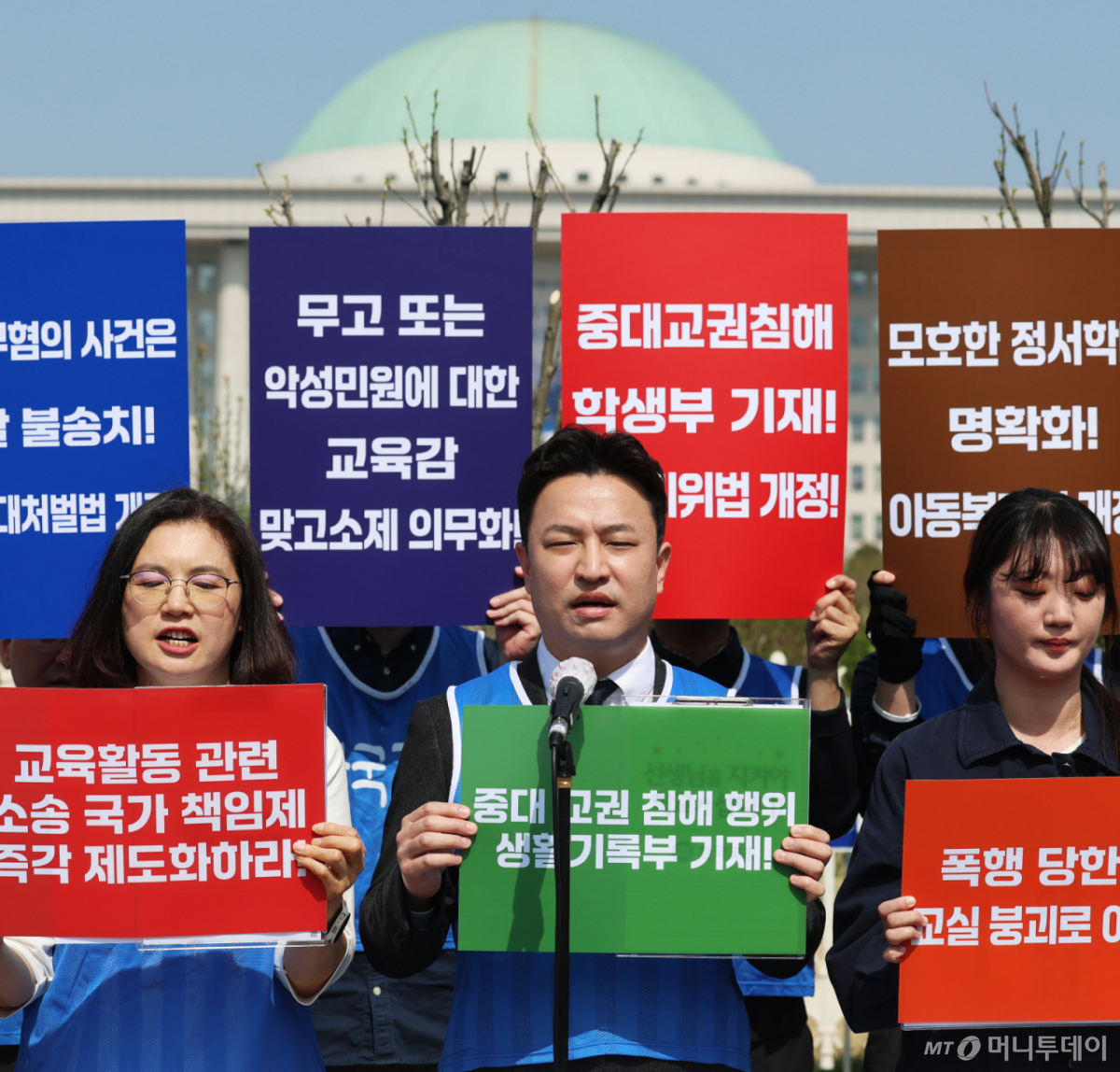 교사 A씨는 화장실에서 초등학교 4학년 학생이 시끄럽게 하자 '조용히 해라'고 말하고 지나갔다. 학생은 "죽여버린다"며 벽돌을 들고 협박했다. 졸업 후에도 찾아와 신체적 접촉 시도 및 도난 사건이 발생했다. 다른 교사 B씨는 지난해 고등학교 남학생에게 치마 안을 촬영당했다. 학생은 교권침해 처분을 받았지만 학생부에는 기재되지 않아 소위 명문대에 진학했다.