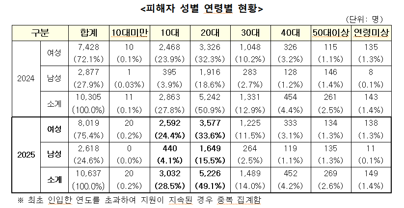 피해자 중 여성은 8019명(75.4%), 남성은 2618명(24.6%)이었다. 연령대별로는 10대와 20대가 전체의 77.6%(8258명)를 차지했다.