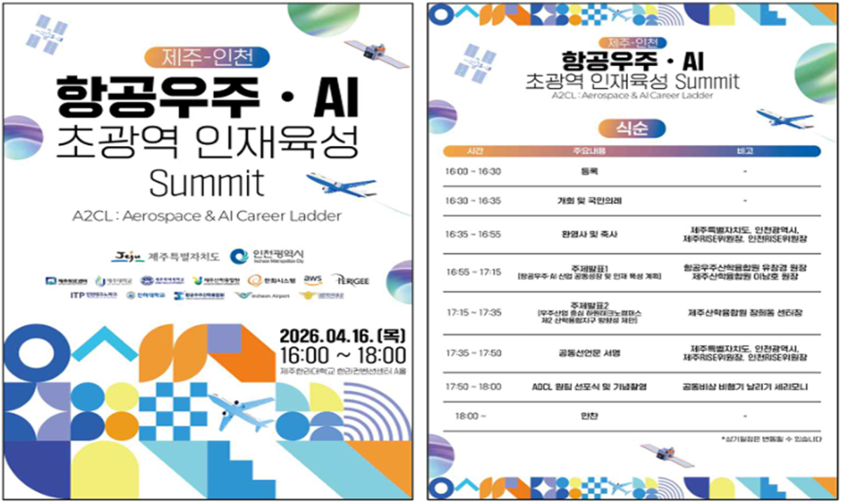 제주특별자치도가 16일 제주한라대 한라컨벤션센터에서 인천시와 함께 '제주-인천 항공우주·AI 초광역 인재육성 서밋'(Summit)을 개최하고, 초광역 협력 체계 구축에 본격적으로 나섰다.