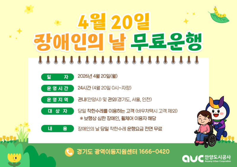 시 관계자는 "장애인의 날을 맞아 준비한 이번 무료 운행이 이동에 제약을 받는 분들에게 작은 응원이 되길 바란다"면서 "앞으로도 교통 약자가 안전하고 편리하게 이동할 수 있도록 안정적인 서비스 제공에 최선을 다하겠다"고 말했다.