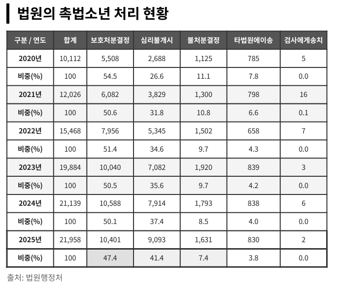 하지만 이중 41%(9093건)는 심리 불개시됐다. 심리 불개시란 판사가 송치 기록을 검토한 뒤 정식 재판 절차를 진행할 필요가 없다고 판단해 사건을 종결하는 것이다. 주로 비행 정도가 가벼워 보호처분이 필요 없거나, 소년이 이미 다른 사건으로 보호처분을 받고 있어 새로운 재판 없이 기존 처분만으로도 충분히 교육 효과가 있다고 판단될 때 내린다.