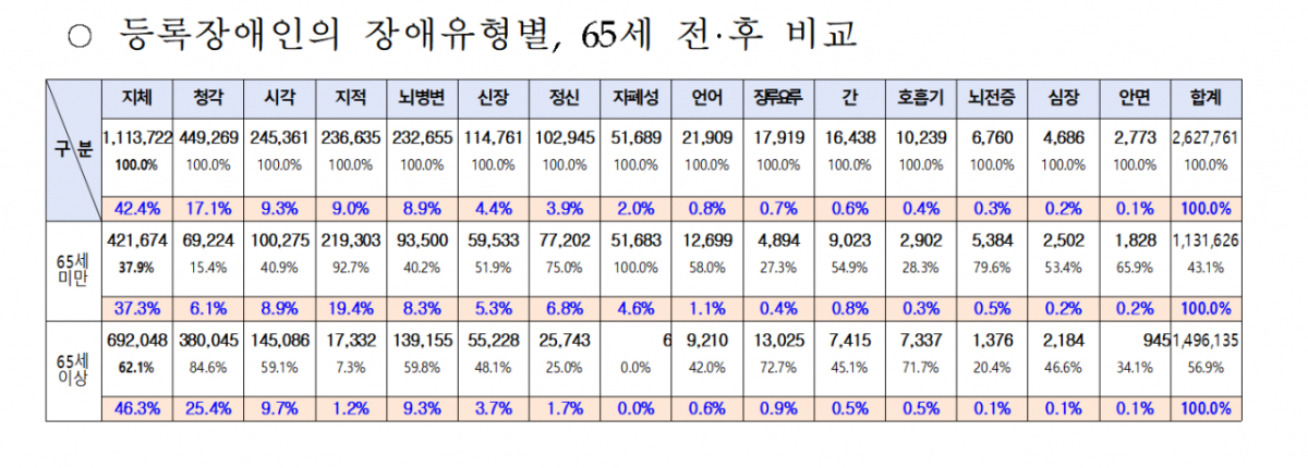 15개 장애유형별 비중은 △지체장애(42.4%) △청각장애(17.1%) △시각장애(9.3%) △지적장애(9%) △뇌병변장애(8.9%) 순으로 나타났다.