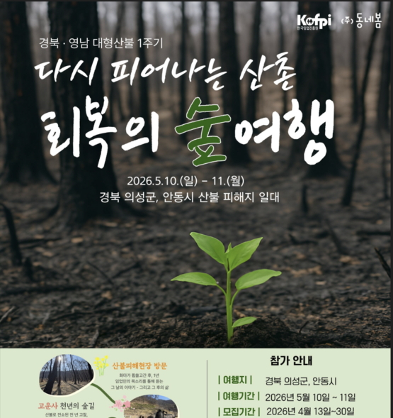 한국임업진흥원은 다음 달 10~11일 경북 의성군과 안동시 산불 피해지역 일대에서 '다시 피어나는 산촌, 회복의 숲 여행' 프로그램을 운영키로 하고 오는 30일까지 신청을 받는다고 20일 밝혔다.
