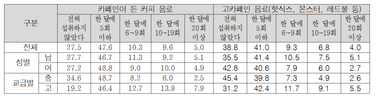 특히 고등학생의 경우 고카페인 음료를 월 10회 이상 마신 비율이 14.6%로 나타나 중학생(7.5%)보다 두 배 가까이 높았다. 커피 역시 고등학생의 월 10회 이상 섭취 비율이 21.7%에 달했다. 카페인을 섭취하지 않으면 일상생활이 어렵다고 응답한 비율은 전체 응답자의 11.2%였다.