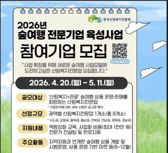 산림청 한국산림복지진흥원은 다음 달 11일까지 '2026년 숲여행 전문기업 육성사업'에 참여할 산림복지전문업을 모집한다고 20일 밝혔다.