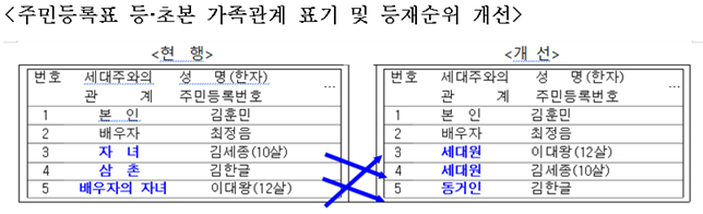 또 '배우자의 자녀'가 '자녀'보다 뒤에 기재되던 방식도 개선된다. 세대주 배우자의 직계존비속을 세대주의 직계존비속과 같은 순위로 등재하도록 해 가족 구성원 간 불필요한 구분을 없앴다.