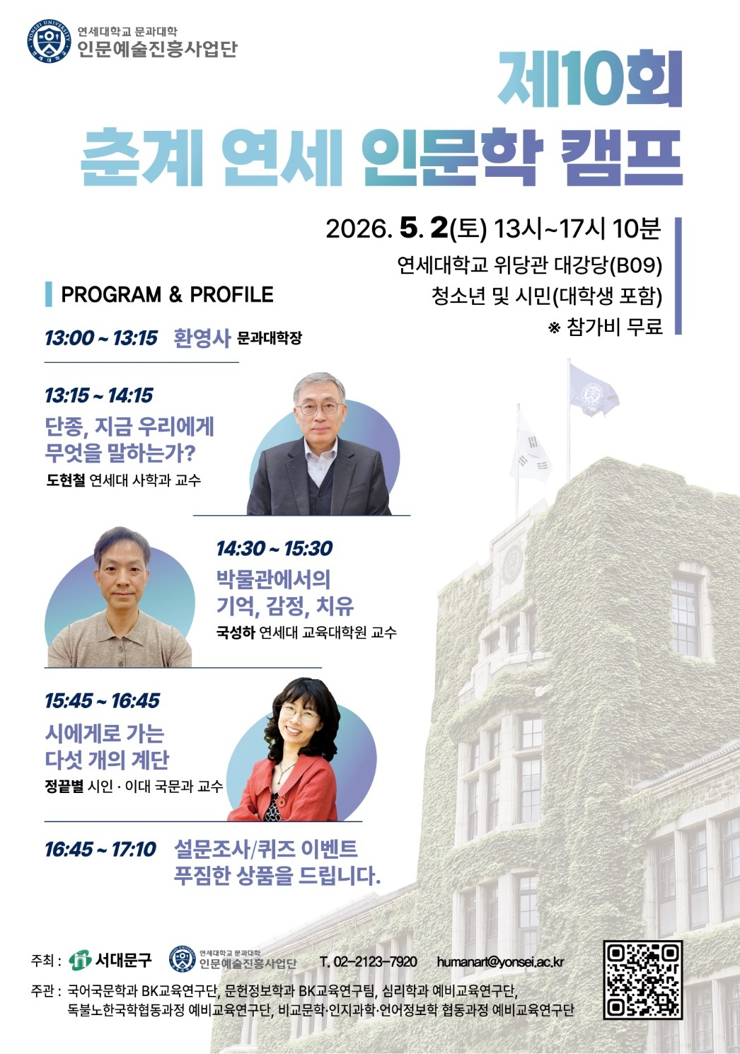 21일 서대문구에 따르면 다음 달 2일 연세대 위당관 대강당(B09호)에서 열리는 이번 캠프는 1,2,3부로 나눠 진행된다. 1부에서 도현철 연세대 사학과 교수가 '단종, 지금 우리에게 무엇을 말하는가?'를 제목으로 강연한다. 2부에서는 국성하 연세대 교육대학원 교수가 '박물관에서의 기억, 감정, 치유'란 주제로 박물관 유물 관람과 체험에서 발생하는 감정적 교감과 정신적 치유를 설명한다. 3부에서는 이화여대 국문과 교수인 정끝별 시인이 '시에게로 가는 다섯 개의 계단'이란 제목 아래 현대 사회에서 시를 읽는다는 것의 본질적 의미를 풀어낸다.