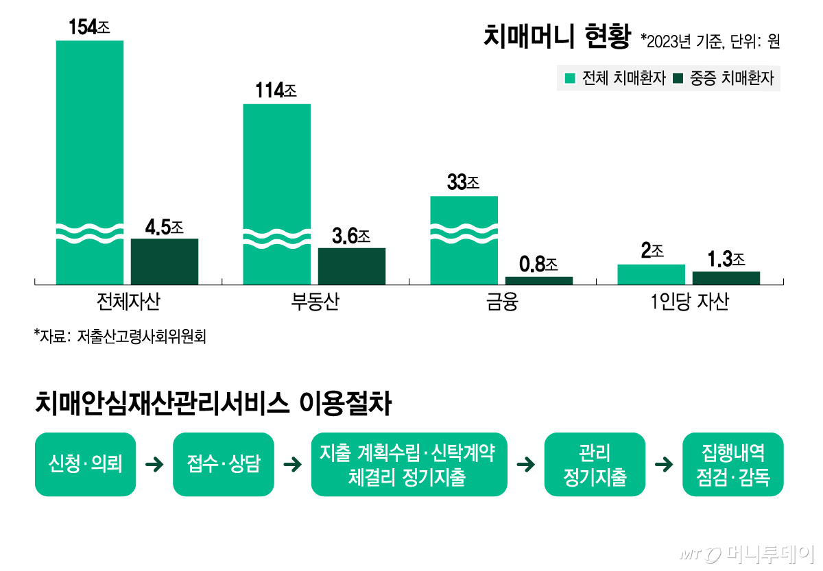 ◇상담 후 재정계획 수립…현금성자산만 관리=21일 정부 추산에 따르면 국내 65세 이상 치매환자가 보유한 자산규모는 약 154조원(2023년 기준)이다. 치매환자는 판단능력이 낮아져 요양원 관계자가 입소환자의 재산을 임의로 사용하거나 재가 치매환자가 임대료를 체납하는 등 재산상 문제가 빈번하게 벌어진다.