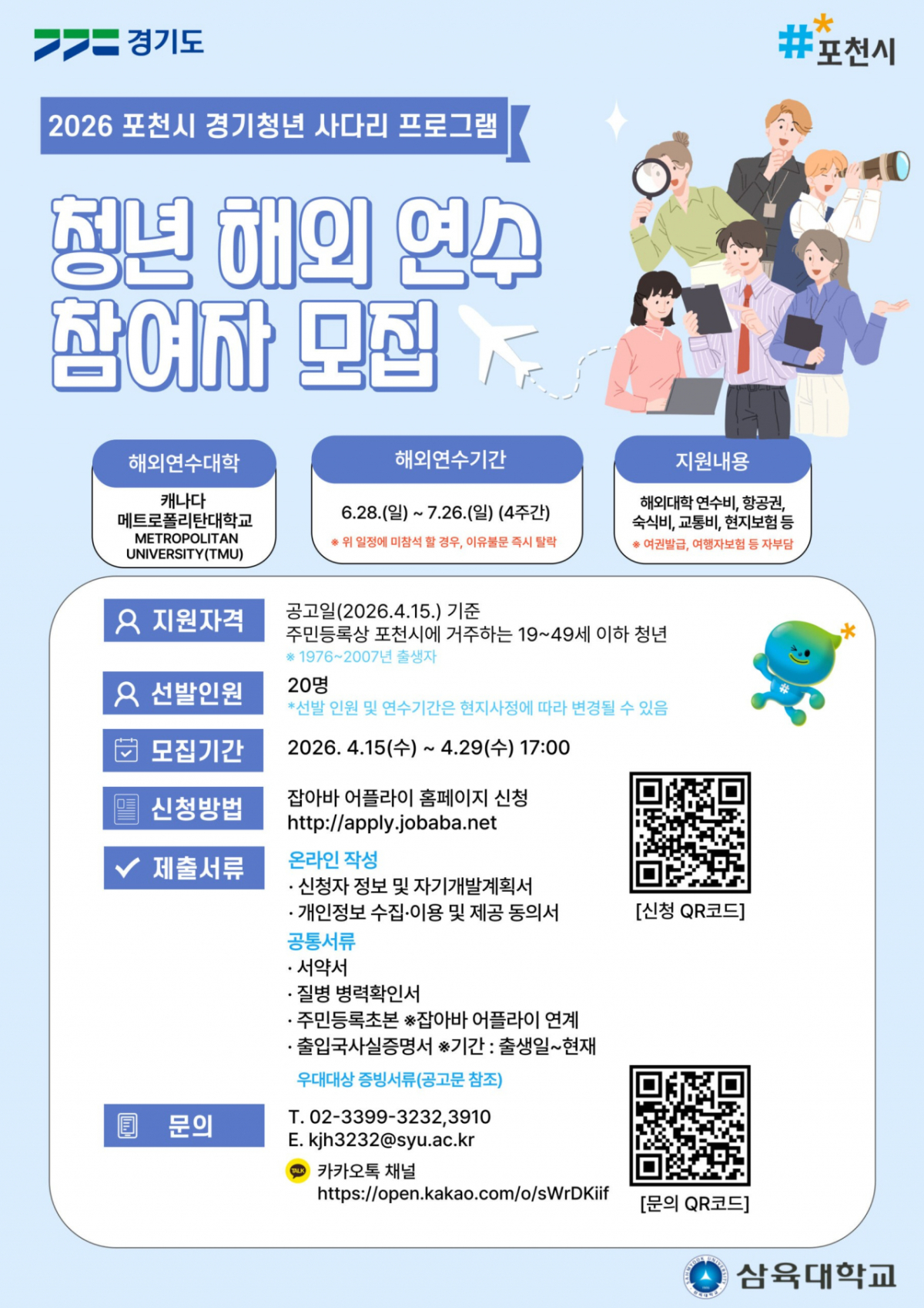 참가 대상은 19~49세 포천시민이며, 시에 거주하는 삼육대 재학생·졸업생도 참가할 수 있다. 취약계층 6명 이상을 포함해 총 20명을 선발한다.