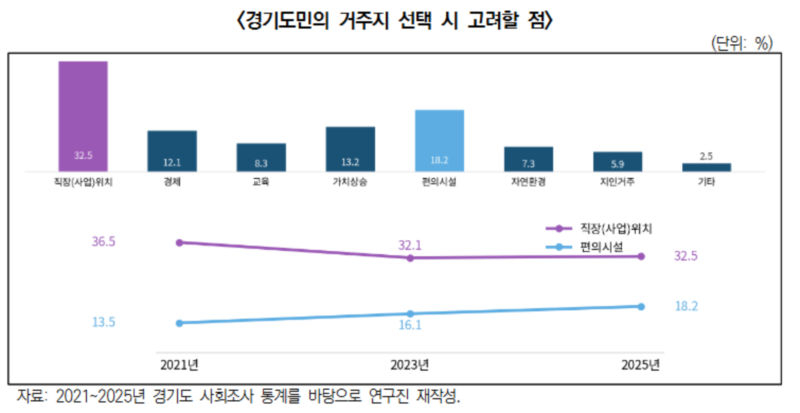 23일 경기연구원이 발표한 보고서에 따르면, 거주지 선택 시 '동네 편의시설'을 중요하게 여기는 도민 비율은 2025년 기준 18.2%로 4년 전보다 4.7%P 증가했다. 슬세권은 도보 10분(약 500m) 내외로 일상에 필요한 시설을 이용할 수 있는 권역을 뜻한다.