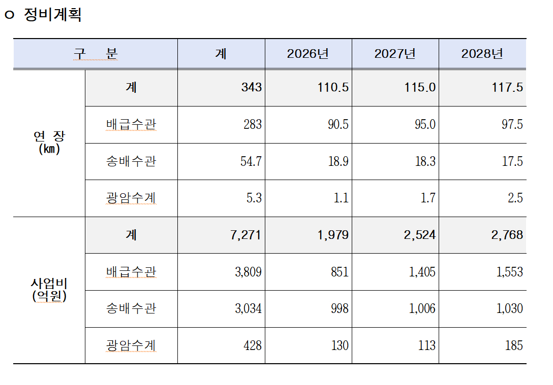 올해부터 정비사업을 본격화해 전년 대비 22%(20㎞) 확대된 111㎞를 정비한다. 이후 2027년에는 115㎞, 2028년에는 117㎞로 연차별로 추진할 계획이다. 시는 앞서 2020년부터 지난해까지 6년 동안 6650억 원을 투입해 364㎞(연평균 61㎞)의 상수도관 교체를 완료했다.