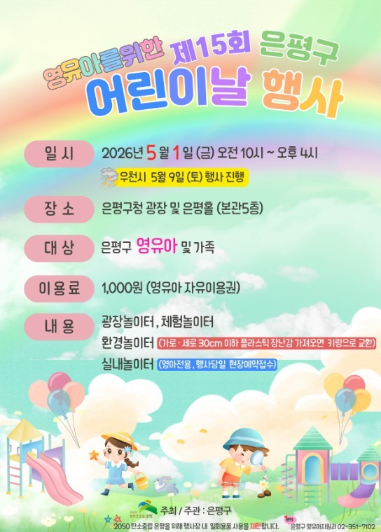 서울 은평구는 어린이날을 맞아 다음 달 1일 은평구청 광장과 은평홀에서 '제15회 영유아를 위한 어린이날 행사'를 개최한다고 23일 밝혔다. 올해로 15회째를 맞은 영유아 어린이날 행사는 영유아가 마음껏 뛰놀고, 일상에서 축제의 즐거움을 경험할 수 있도록 마련됐다.