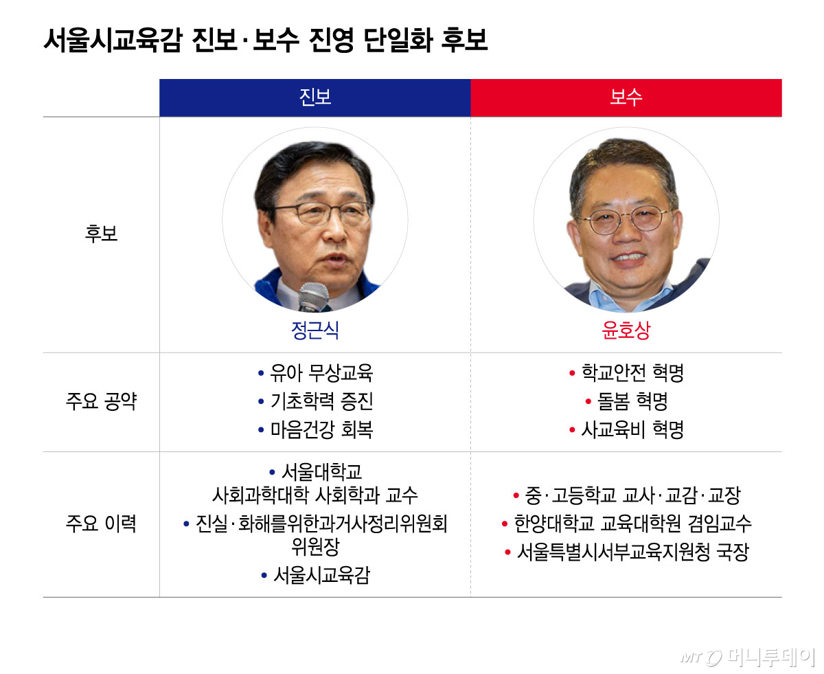 서울시교육감 선거가 진보·보수진영의 단일화 후보 확정으로 본격적인 대진표를 갖췄다. 현직인 정근식 교육감과 윤호상 한양대학교 교육대학원 겸임교수가 맞붙는 구도다. 다만 양 진영 내부에서 단일화 결과에 대한 불복 움직임이 이어지면서 다자구도로 재편될 가능성도 남아 있다.