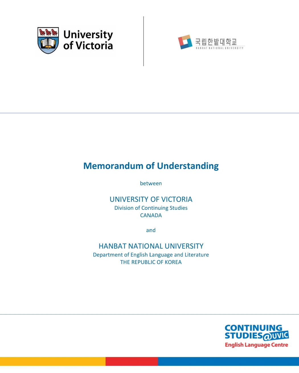 국립한밭대학교 영어영문학과가 지난 22일 캐나다 빅토리아대학교와 어학연수 프로그램 운영을 위한 업무협약(MOU)을 체결했다고 27일 밝혔다.