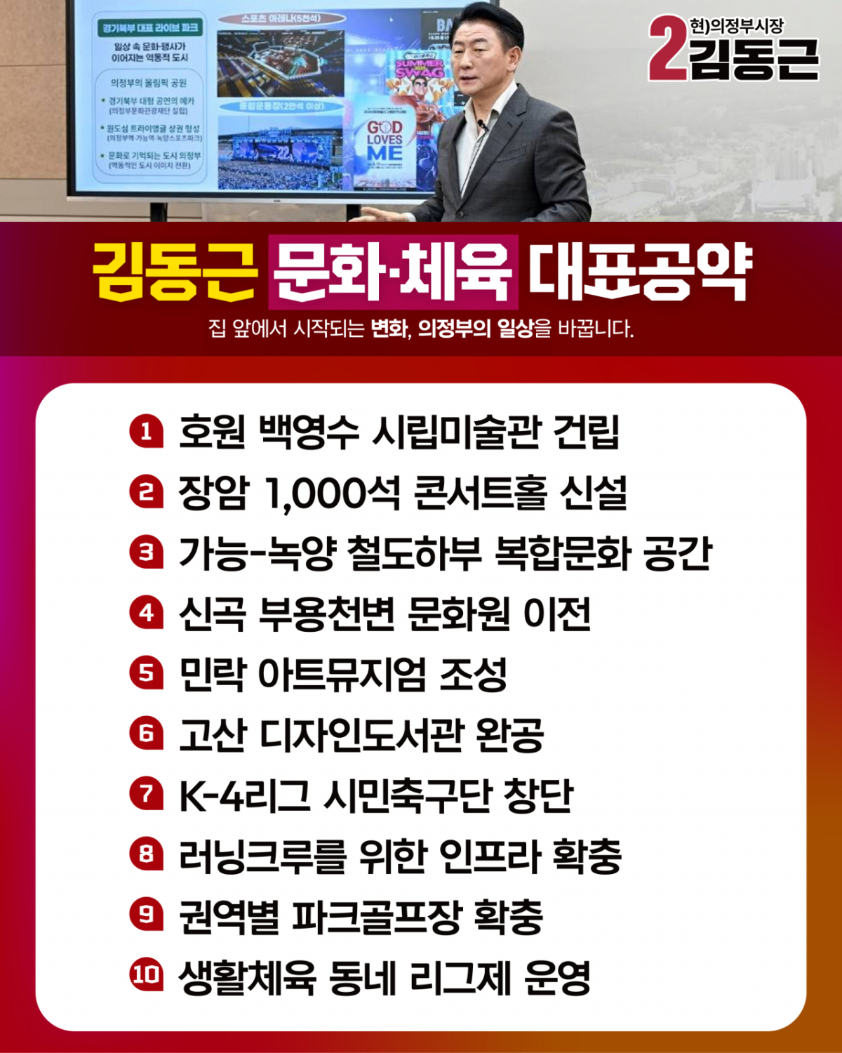 문화·체육 대표 10대 공약은 △호원 백영수 시립미술관 건립 △장암 1000석 콘서트홀 신설 △가능-녹양 철도 하부 복합문화 공간 △신곡 부용천변 문화원 이전 △민락 아트뮤지엄 조성 △고산 디자인도서관 완공 △K-4리그 시민축구단 창단 △러닝크루를 위한 인프라 확충 △권역별 파크골프장 확충 △생활체육 동네 리그제 운영 등이다.