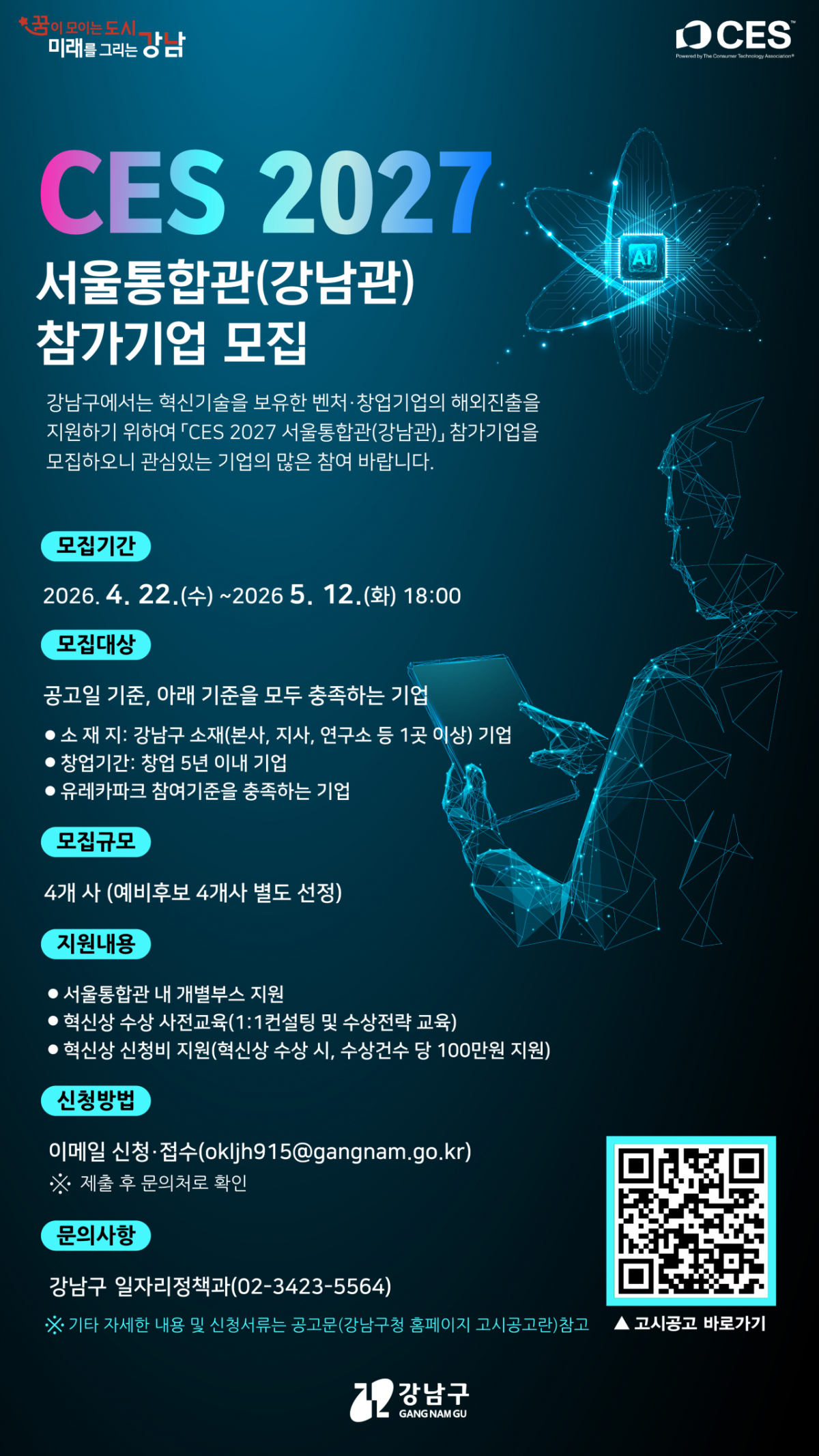 서울 강남구는 세계 최대 IT·전자 전시회인 CES 2027 '서울통합관(강남관)'에 참여할 스타트업을 모집한다고 27일 밝혔다.