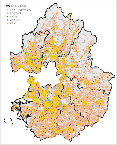 보건복지부 조사에 따르면 노인의 87.2%는 건강이 유지될 경우 현재 집에서 계속 살기를 희망한다. 그러나 경기도 내 노인복지시설(1만6908개)은 지역 간 편차가 크고, 신규 개발지 등은 도보 5분 내 접근율이 1~2%에 불과해 인프라가 부족하다. 또 재가복지시설은 4396개가 있지만, 노인복지관은 67개로 전체 복지시설의 1%에도 못 미친다.