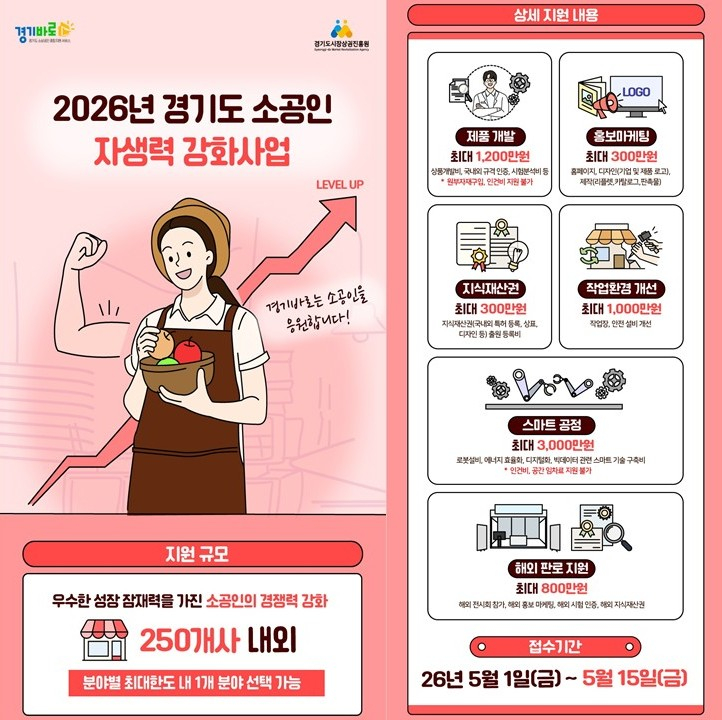 참여를 희망하는 소공인은 오는 5월1일부터 15일 오후6시까지 '경기바로'누리집을 통해 온라인으로 신청하면 된다. 심사는 정량·정성 평가를 거쳐 60점 이상 고득점순으로 선정될 예정이며, 선정 결과는 6월 중 개별 통보된다.