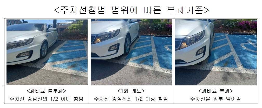 다만 중심선을 기준으로 절반 이상 넘어간 경우에는 주차선 침범으로 간주하며, 최초 1회에 한해 계도 조치가 이루어진다. 차량이 주차구획선을 명확히 넘어 장애인전용주차구역 안으로 일부라도 침범한 경우에는 관련 법령에 따라 10만원의 과태료를 부과한다.
