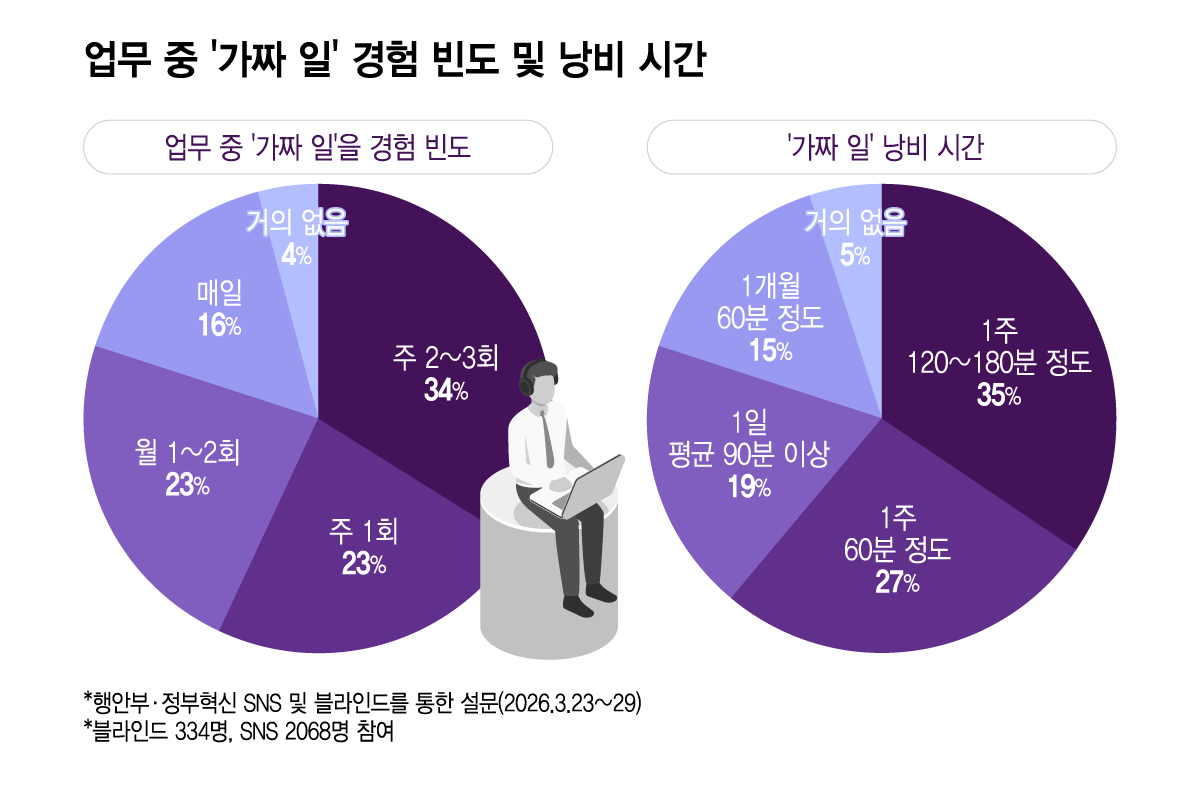 직장인이라면 한 번쯤 겪었을 '가짜 일'은 공공과 민간을 가리지 않고 광범위하게 나타나고 있다. 행안부가 지난 3월 블라인드와 SNS(소셜미디어)를 통해 약 2400명을 대상으로 설문조사 및 댓글 이벤트를 진행한 결과에 따르면 응답자의 절반 이상이 주 2~3회 '가짜 일'을 경험한다고 답했다.