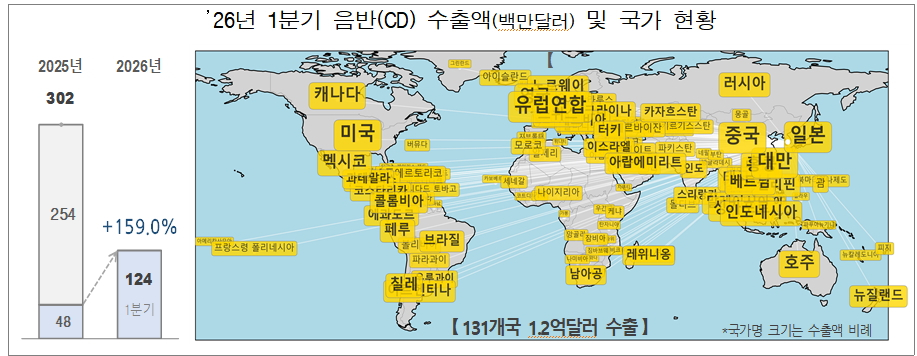 관세청 관계자는 "이같은 음반 수출증가세는 일부 국가에 국한된 것이 아니라 131개국 중 상위 5개국을 포함한 94개국(비중 72%)에서 1분기 최대 실적을 기록해 일부 지역 집중이 아닌 고른 성장세를 보였다"고 말했다.
