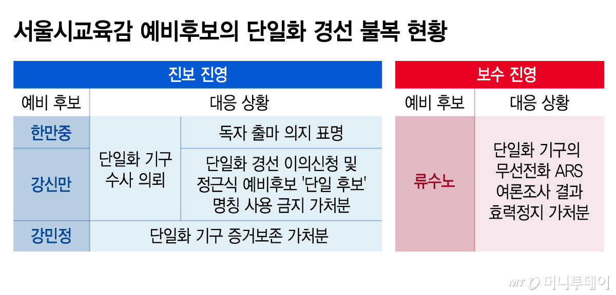 서울시교육감 선거에서 진보·보수진영이 각각 단일후보를 확정했지만 경선과정의 공정성을 둘러싼 잡음이 이어진다. 단일화 경쟁에서 탈락한 예비후보들이 잇따라 독자 출마 가능성을 내비치면서 표분산 가능성도 커졌다. 경기지역에서도 유사한 갈등이 불거진다.