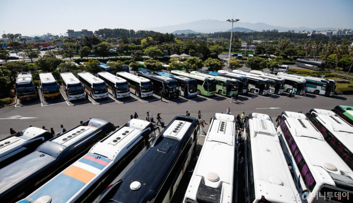 ![[제주=뉴시스] 우장호 기자 = 맑은 날씨를 보인 29일 오전 제주국제공항 버스 전용 주차장에 수학여행단 학생들을 기다리는 전세버스가 빼곡히 주차돼 있다. 사진은 기사과 관련이 없음. 2025.04.29. /사진=우장호](https://thumb.mt.co.kr/cdn-cgi/image/f=avif/21/2026/04/2026042915313881231_1.jpg)