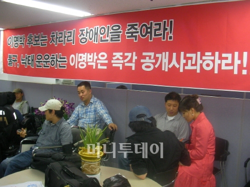 이들은 '이명박 후보는 차라리 장애인을 죽여라'는 등의 문구가 적힌 플래카드를 건물 외벽에 내걸고 이 전 시장의 직접 사과를 요구하고 있다.