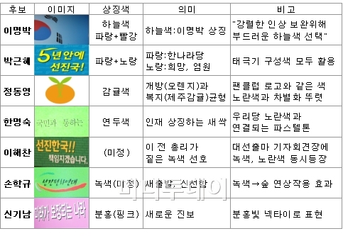대선주자들의 색깔은 무엇일까. 정치적 색깔 말고 진짜 '컬러'얘기다. 한나라당엔 역시 파란색 물결이다.