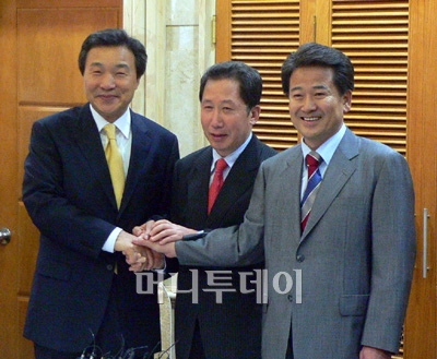 김근태 전 열린우리당 의장(가운데), 손학규 전 경기지사(왼쪽), 정동영 전 의장(오른쪽)이 27일 굳게 손을 잡았다.